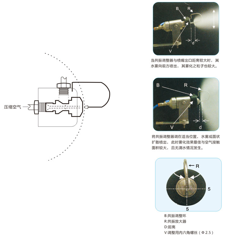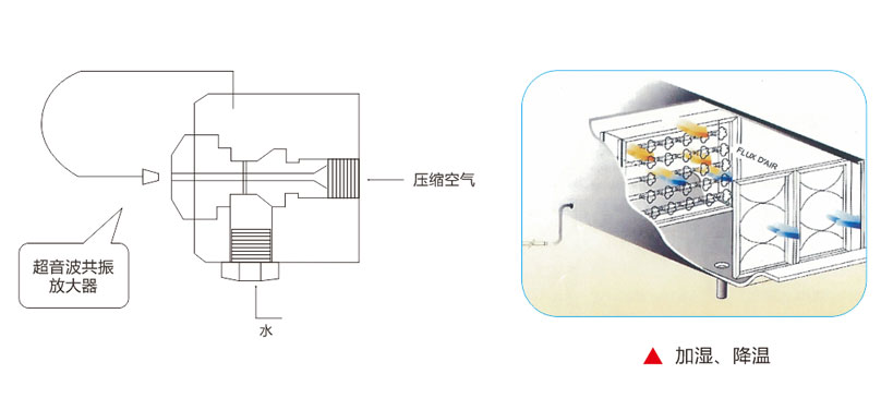 壓縮空氣經(jīng)過文氏管,垂直撞擊水流,將水霧化成小水珠,以接近聲速的超高速度經(jīng)噴嘴出口再次直線撞擊置于噴嘴前端的超音波共振放大器并產(chǎn)生超音波共振現(xiàn)象。利用音波反射原理所增強的超音波能量打破水珠的內(nèi)聚力,使水珠分散成更多更細小的微水珠,且將微水珠由粒狀變成薄面狀,增大數(shù)百倍與空氣接觸的面積,使微水珠不僅迅速而且容易被空氣所吸收,從而達到降溫加濕的作用。