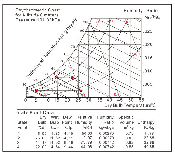 外氣5ºC DB及50%RH(如圖示之點1) 外氣先預(yù)熱至26ºC DB(如圖示之點2) 水霧加濕提高含水率至73.79%RH,14.13ºC DB(如圖示之點3) |