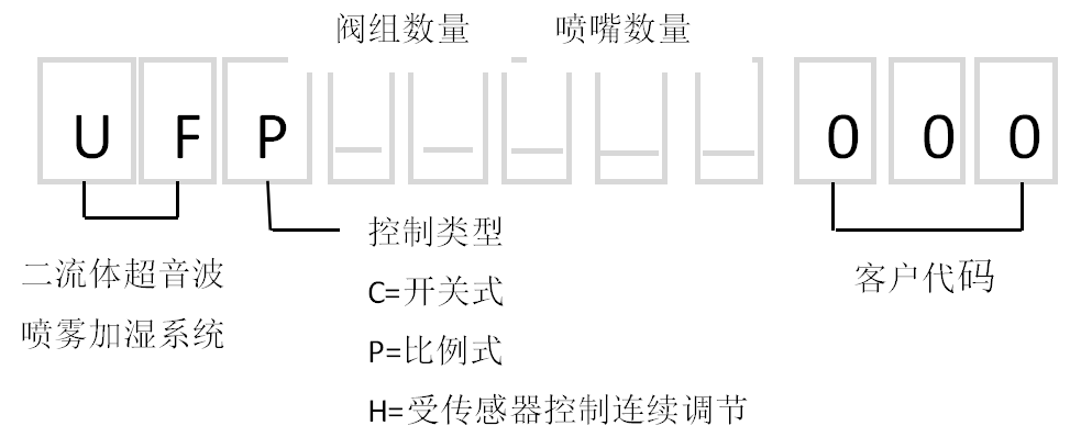 例:UFP04072 UF表示超音波噴霧加濕系統(tǒng) P表示比例控制 04表示閥組數(shù)量 072表示噴嘴需求量